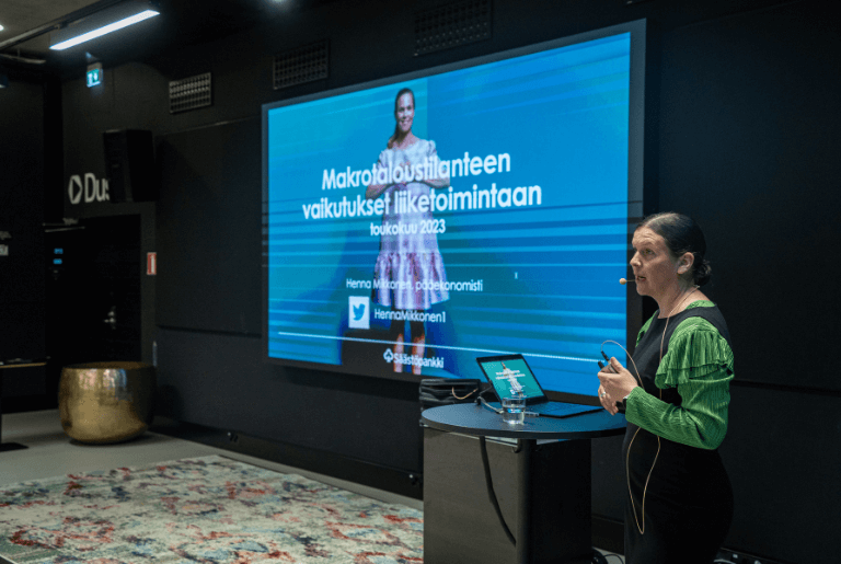 Säästöpankilta saimme puhujaksi huikean pääekonomistina toimivan Henna Mikkosen. Henna puhui kuuntelijoille makrotaloustilanteen vaikutuksista liiketoimintaan ja kasvuun. Puheen kantava teema oli muutos: Kaikki muuttuu jossakin kohtaa, eikä tulevaisuus ole taattua. Henna loi yleisölle kuitenkin optimistista kuvaa tulevasta tilanteesta. Toukokuun 2023 Euroviisujen lähestyessä Henna oli pukeutunut Käärijä-teemaisesti vihreään boleroon.